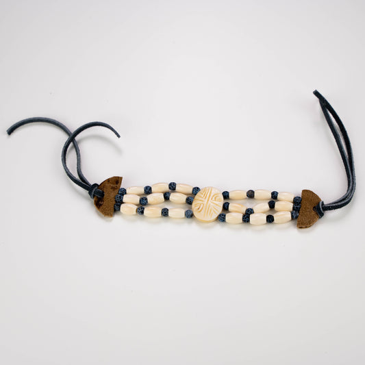 Authentic, Cow Bone, 6-7" 3 Strand Bracelet, Indigenous Made, Weathered Blue Sand Stone accent beads, Leather Tie,
