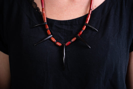 Choker, 18" adjustable, Black Buffalo Horn, Pipe Stone Red Beads, Metal Spacers, Adjustable Leather tie, Indigenous made