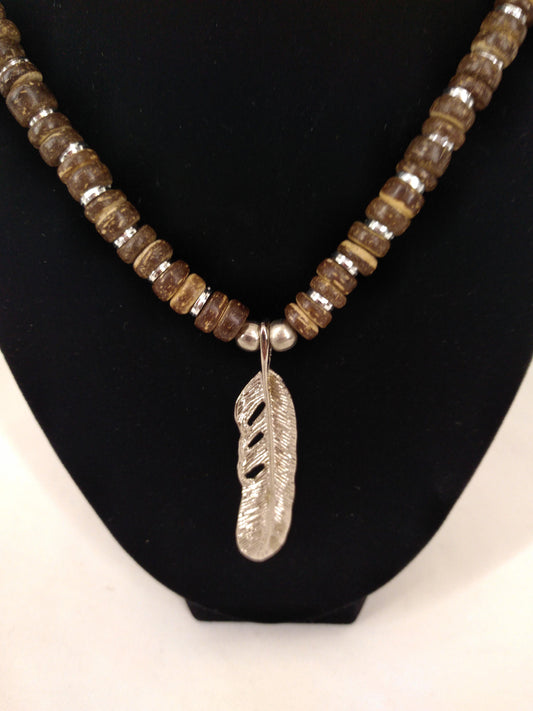 Feather Beaded Necklace, Wood, Metal, Screw Clasp, 18"