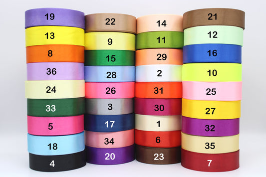 Single Face Ribbon in 36 different colors. Great item for Ribbon Skirts, Ribbon Shirts, Regalia, decorations, crafting, and appliqué. This ribbon comes in 5 different widths, and is available in different lengths to suit your needs