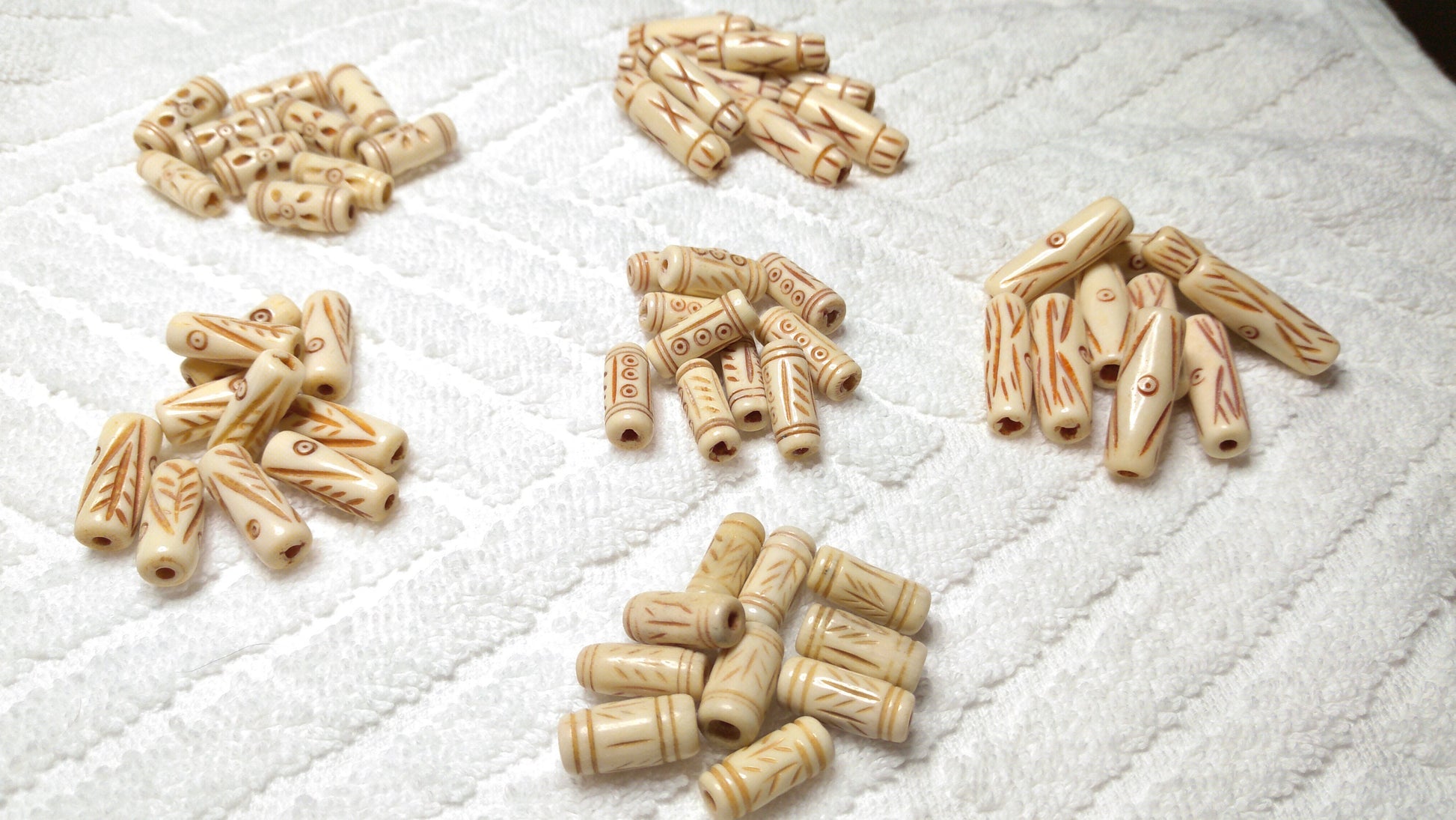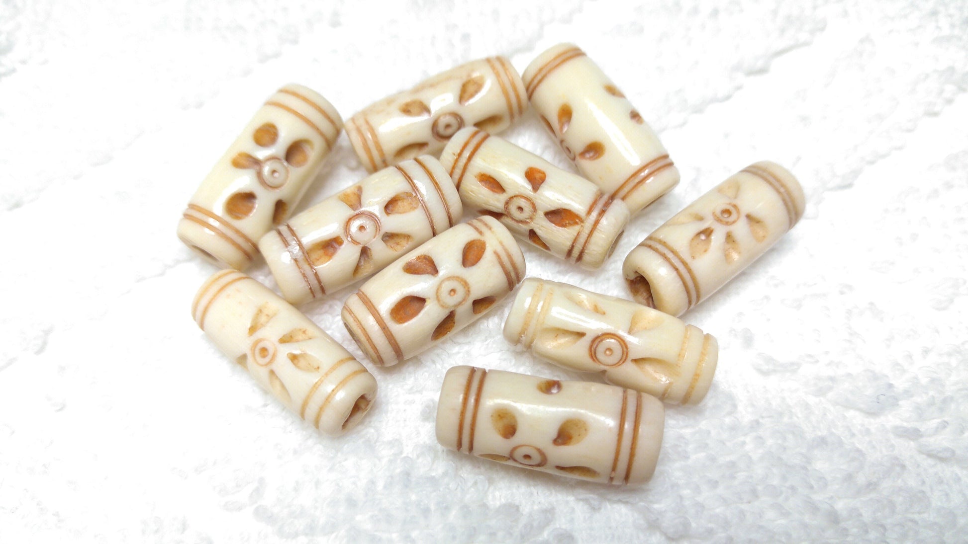 Beautifully Handcrafted Cow Bone Tubular accent beads for your Necklace or Choker. These beads come in sets of 10 pieces. Please see photos for close ups of the style of carving on your beads. Like all things Hand crafted, no two are identical.