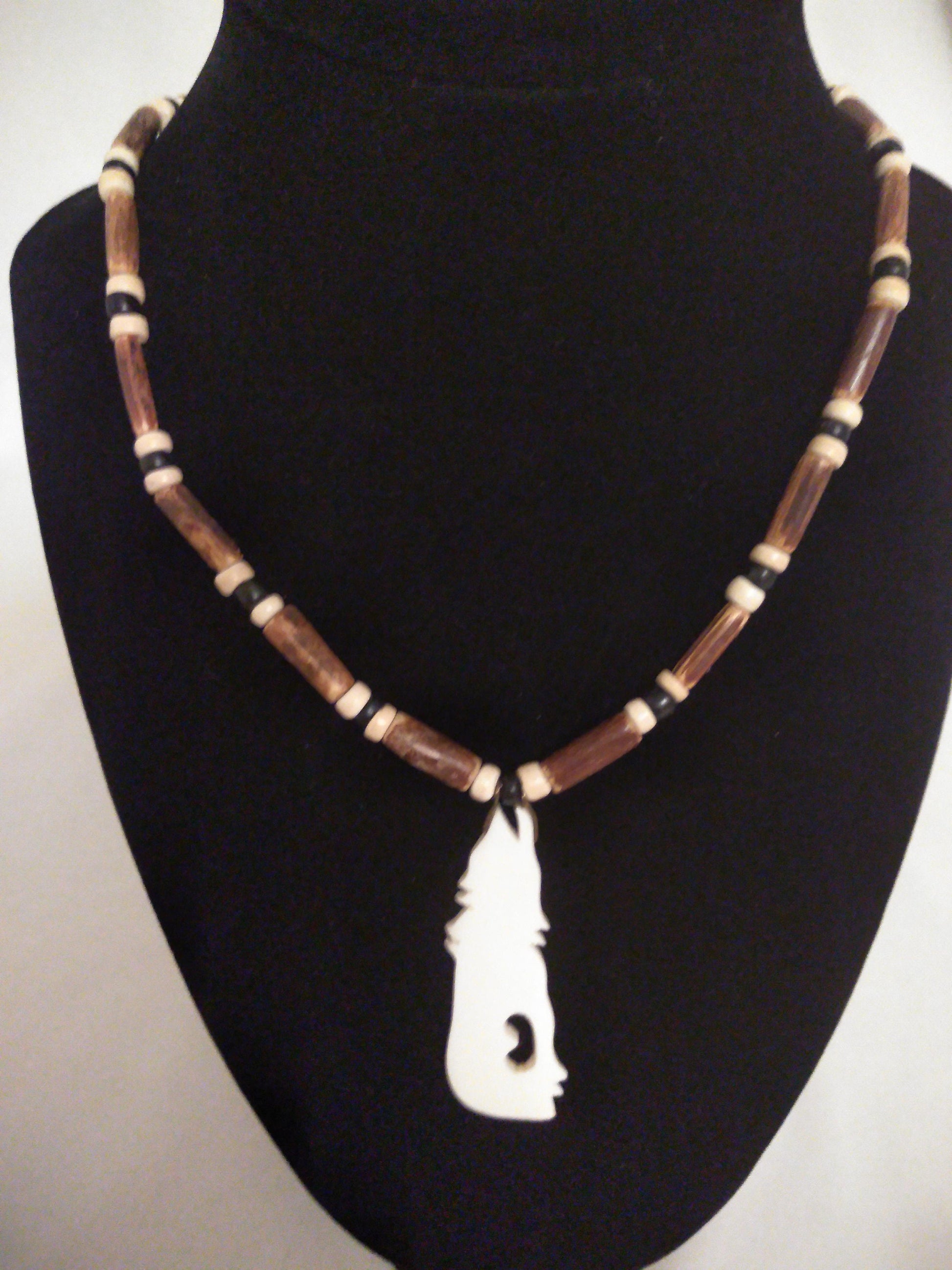 18" Hand Crafted Necklace created with all natural wooden and Stone beads and a Cow Bone Hand Carved Pendant.