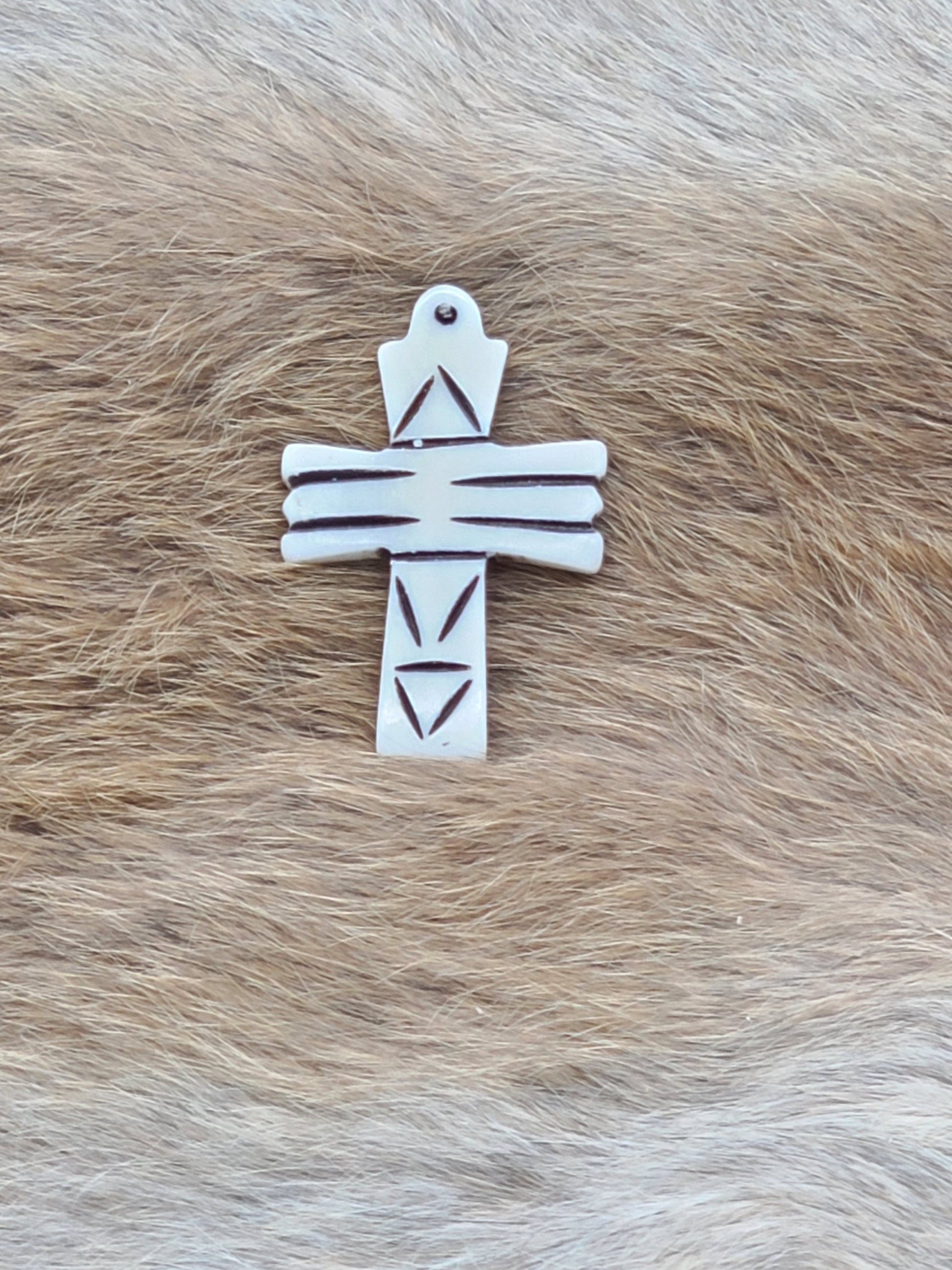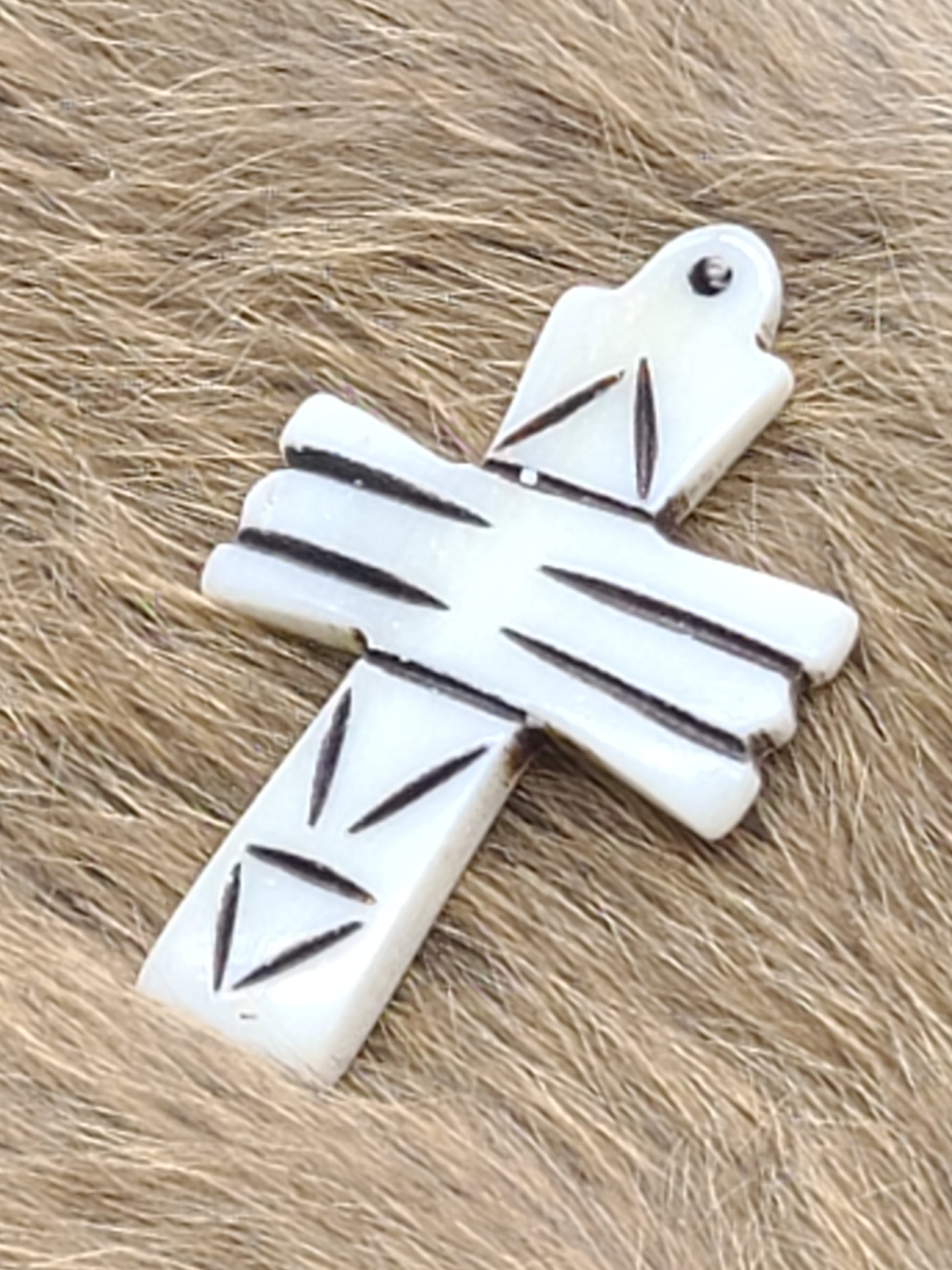 Introducing our Bone Pendant Small Cross, a unique and handcrafted piece that is sure to stand out. Hand carved and hand painted to enhance the intricate etchings on the bone, each pendant is one-of-a-kind. Measuring at 1 1/2" x 1", it is perfect for daily wear or as a statement piece. Pre-drilled for easy wearing.