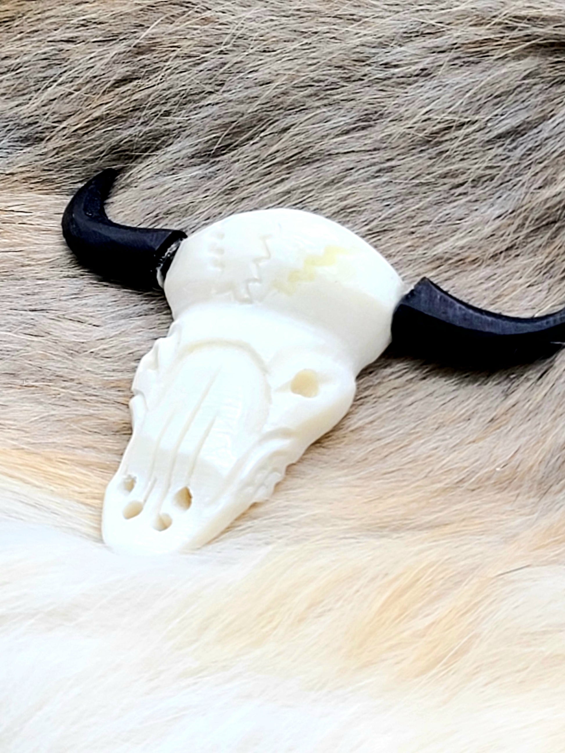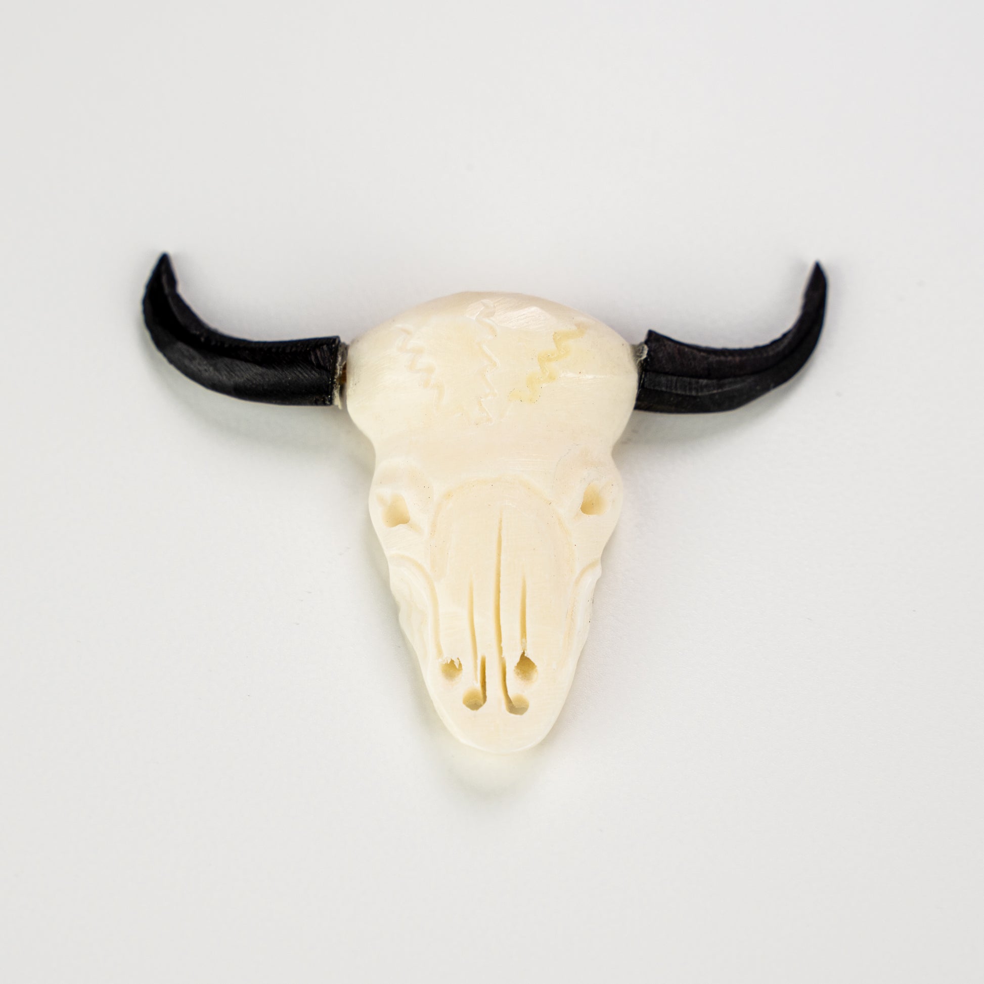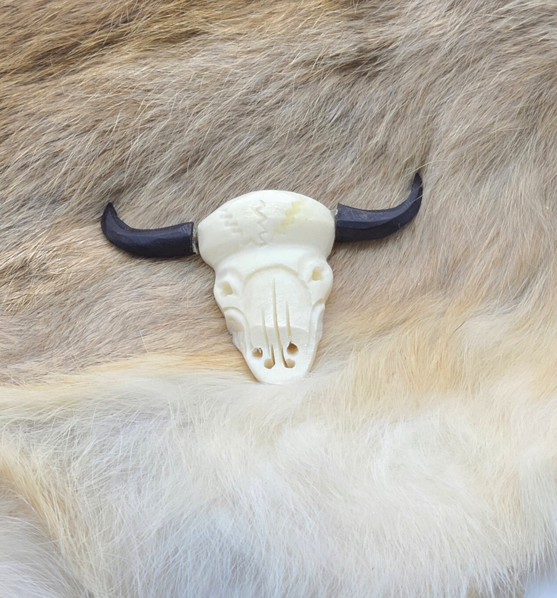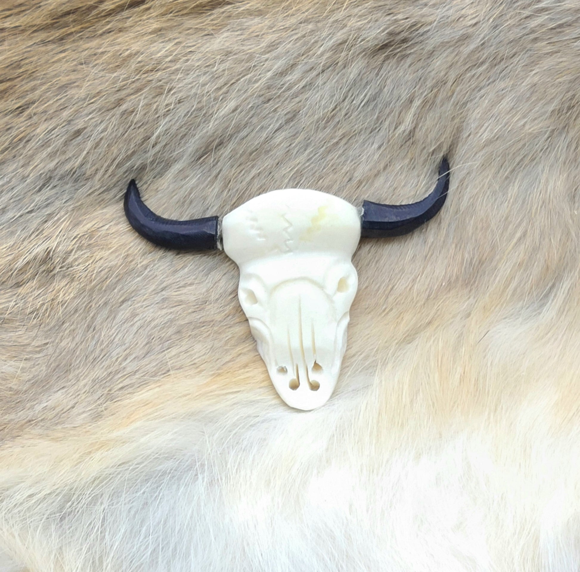 Hand carved from Cow Bone. Horns are carved from Black Buffalo Horn. No 2 pieces are alike. Makes a great Necklace, Tie Pin, Broach, or use as a decoration on a lapel or hat. Variations are slight.