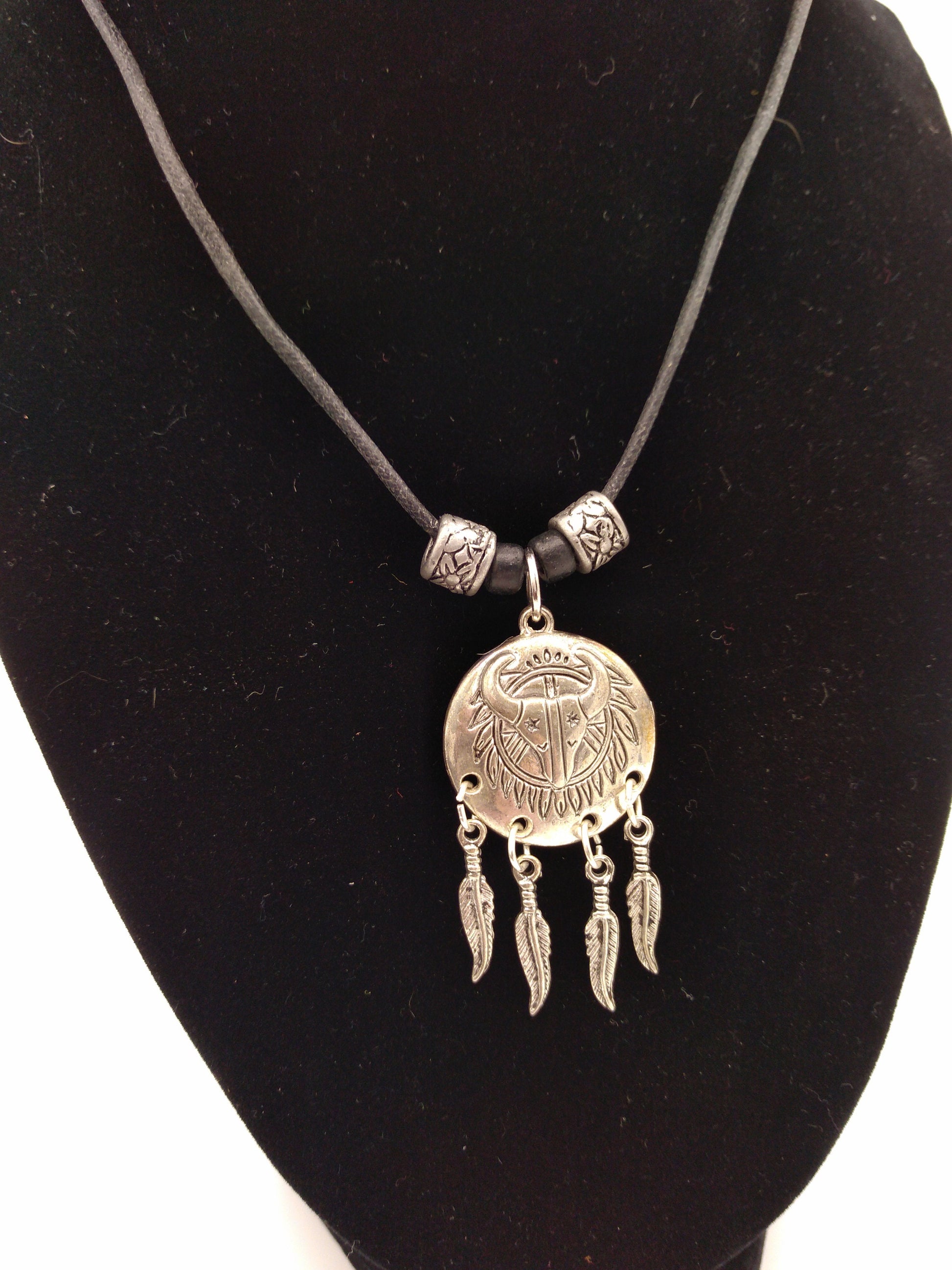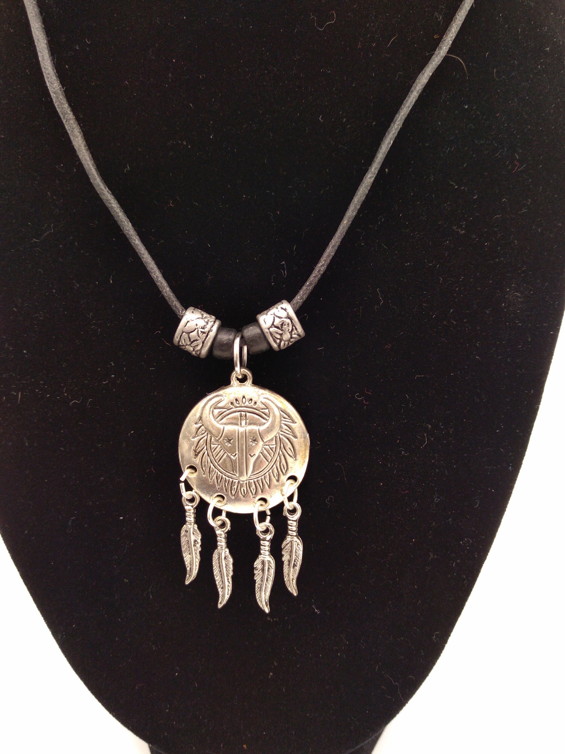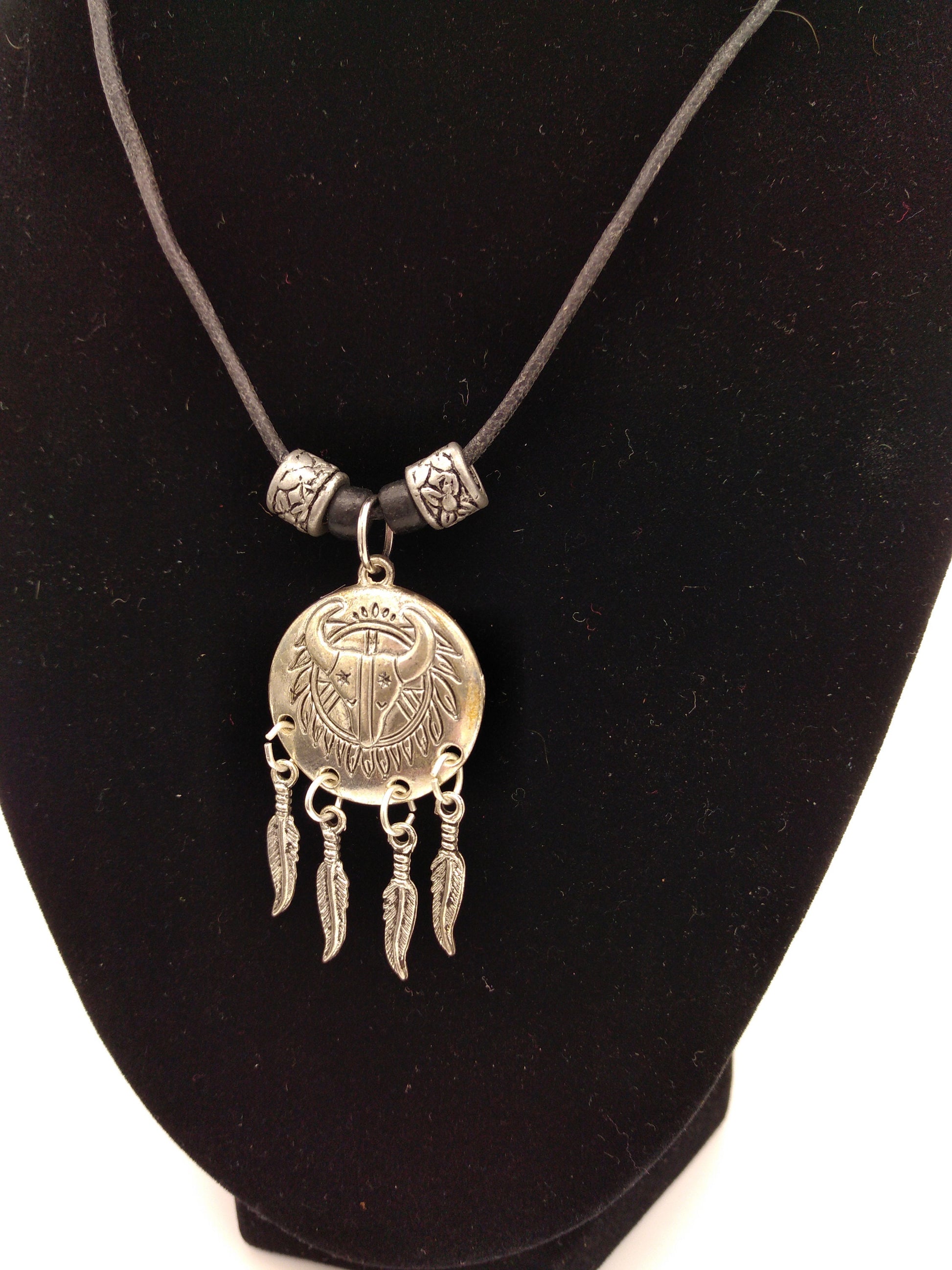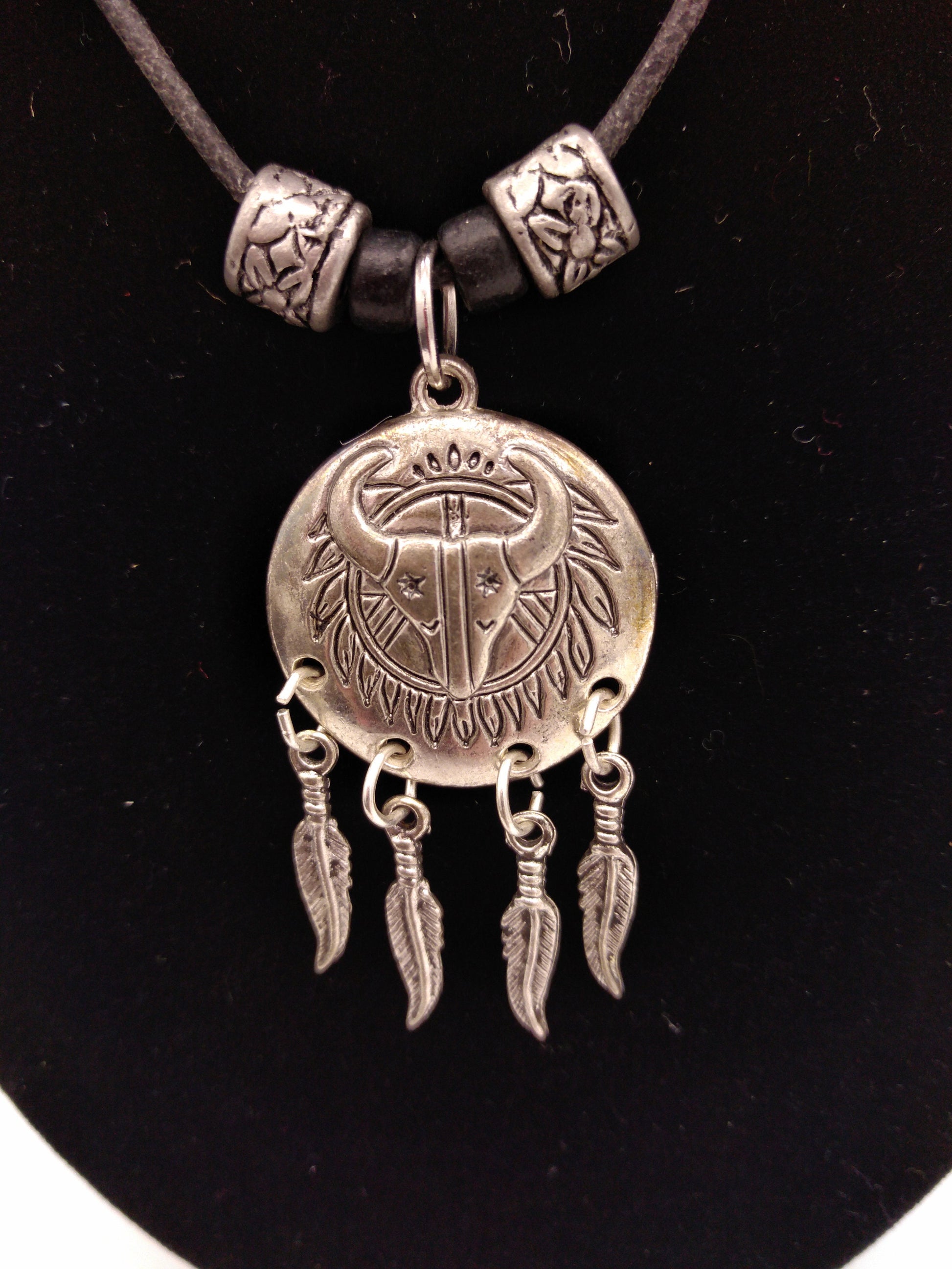Buffalo Skull Metal Pendant with 4 mounted metal Feathers and mounting ring. Or purchase as a finished necklace. Mounted on a unisex sliding waxed cord. This allows for an adjustable length to go over your head with no clasps. Customize any necklace with your choice of spacers, beads or pipes. Prices can be adjusted. Please inquire