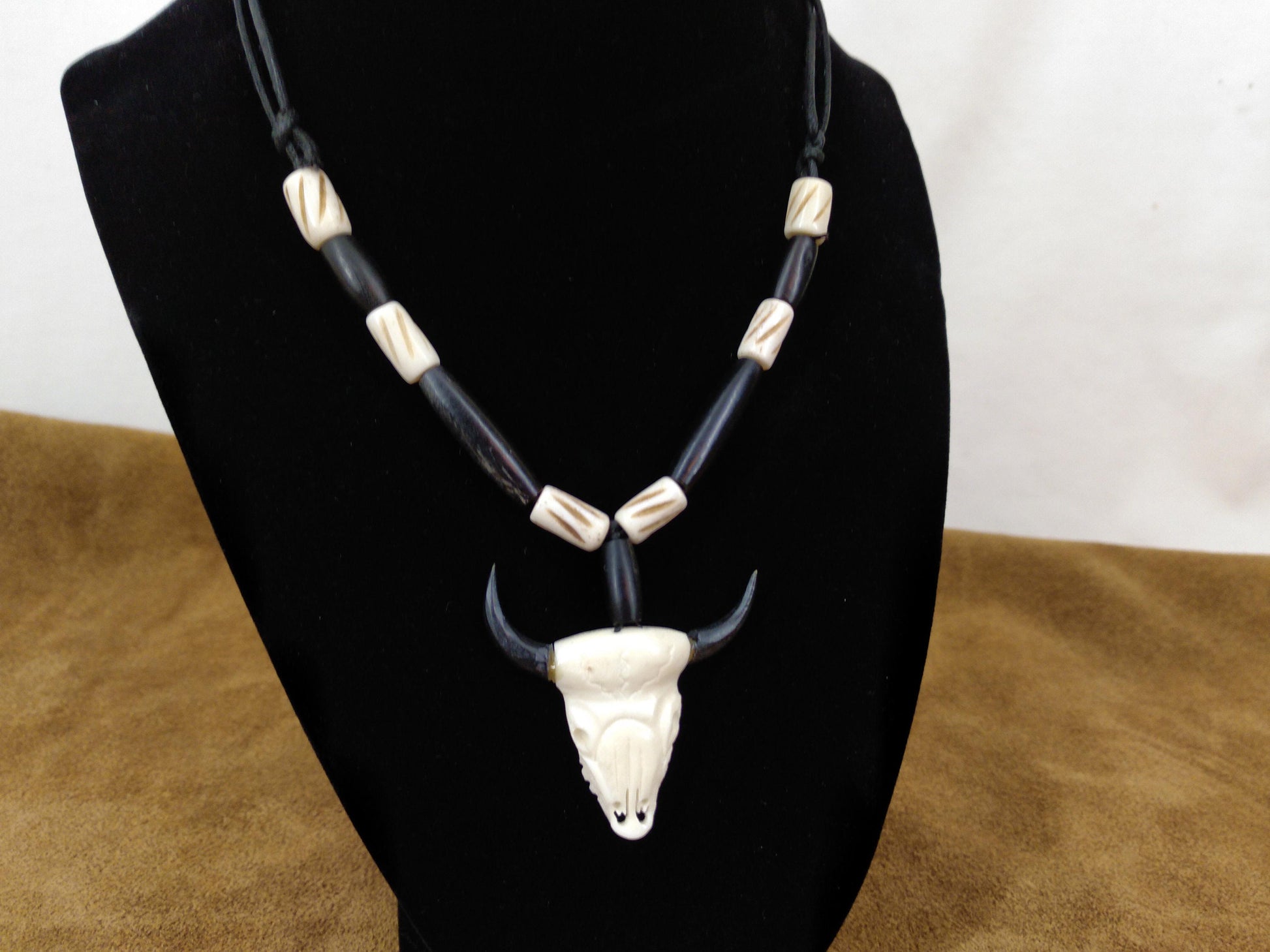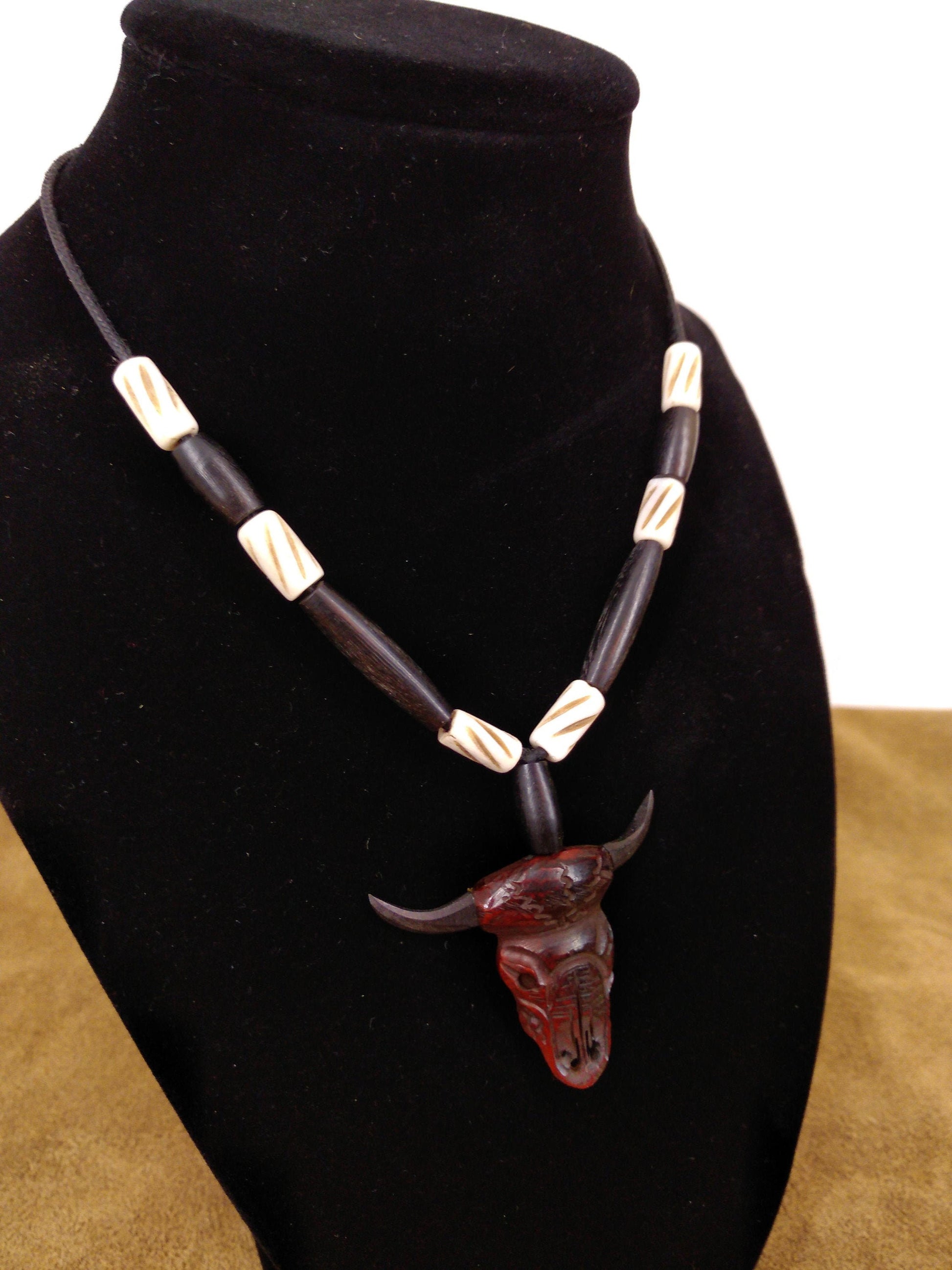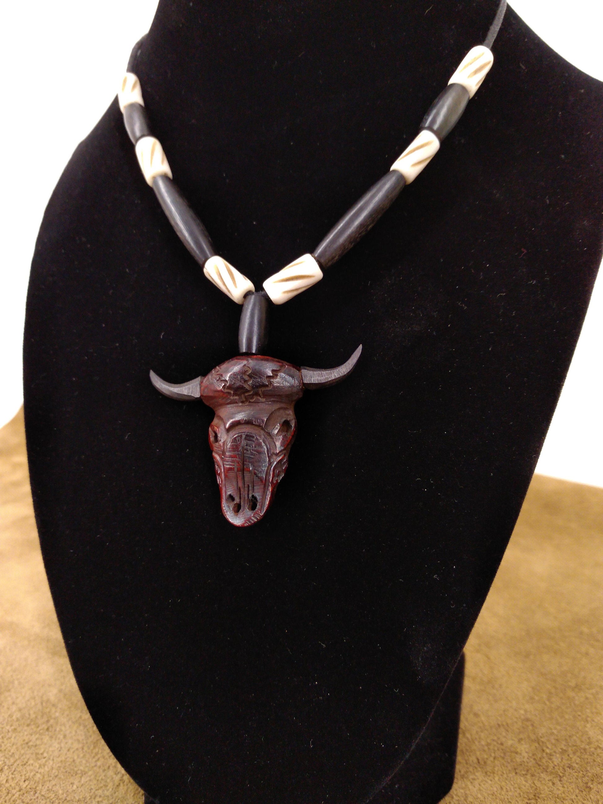 Cow Bone and Black Buffalo Horn skull Necklace, Hand Carved, Hand Crafted