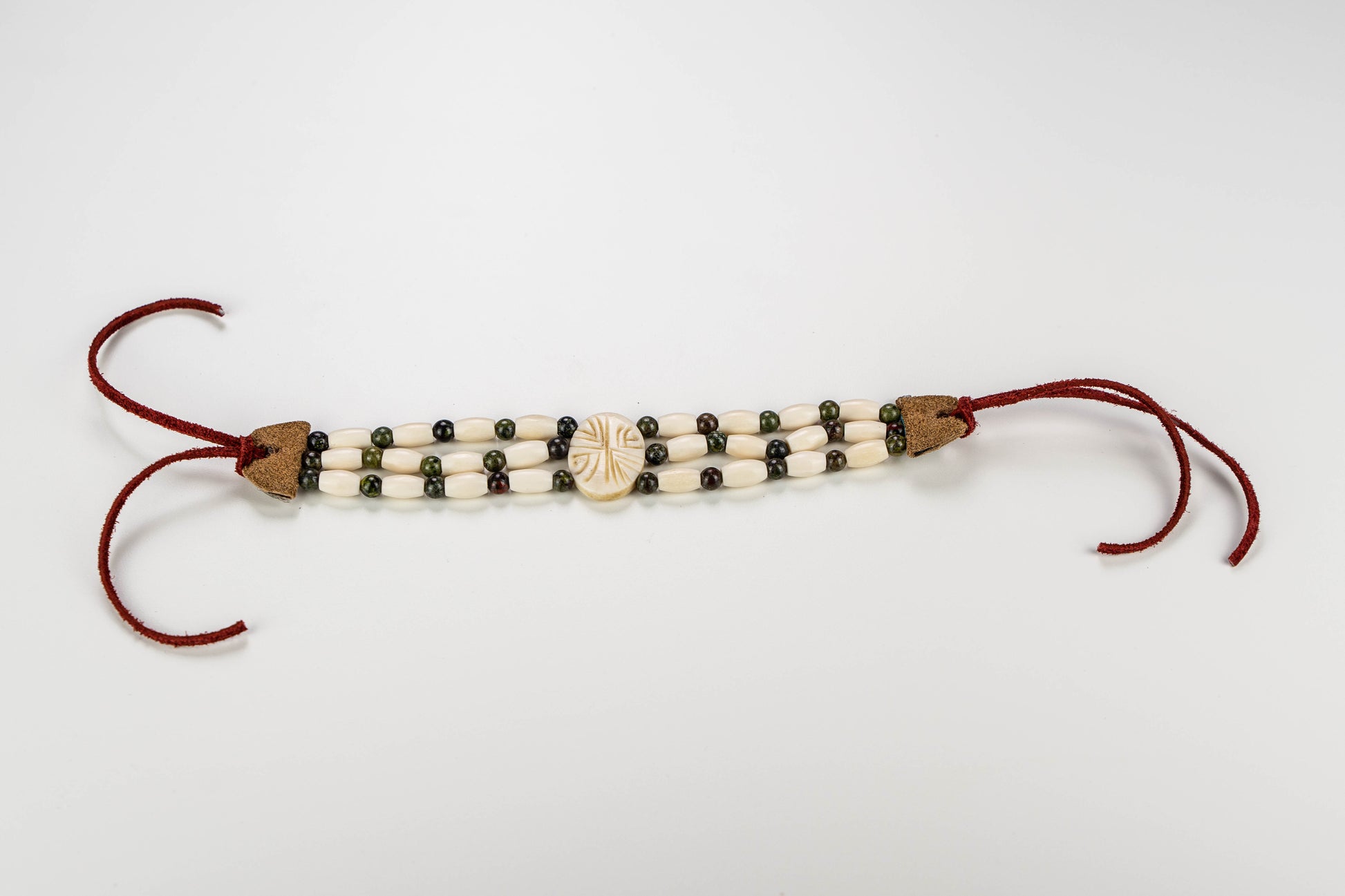 This gorgeous 3 Strand Bracelet can easily be worn in any setting. Indigenous made, this bracelet has a beautiful Oval Bone, hand carved spacer. Mounted using Sim. Sinew for strength and durability. Like all the objects I make, this bracelet style will be limited in the colors and styles to keep the bracelets as unique to you as possible. Keep watching! there will be additional styles and colors coming to this line. Please feel free to add the circumference of your wrist so that your bracelet can be adjusted to you.