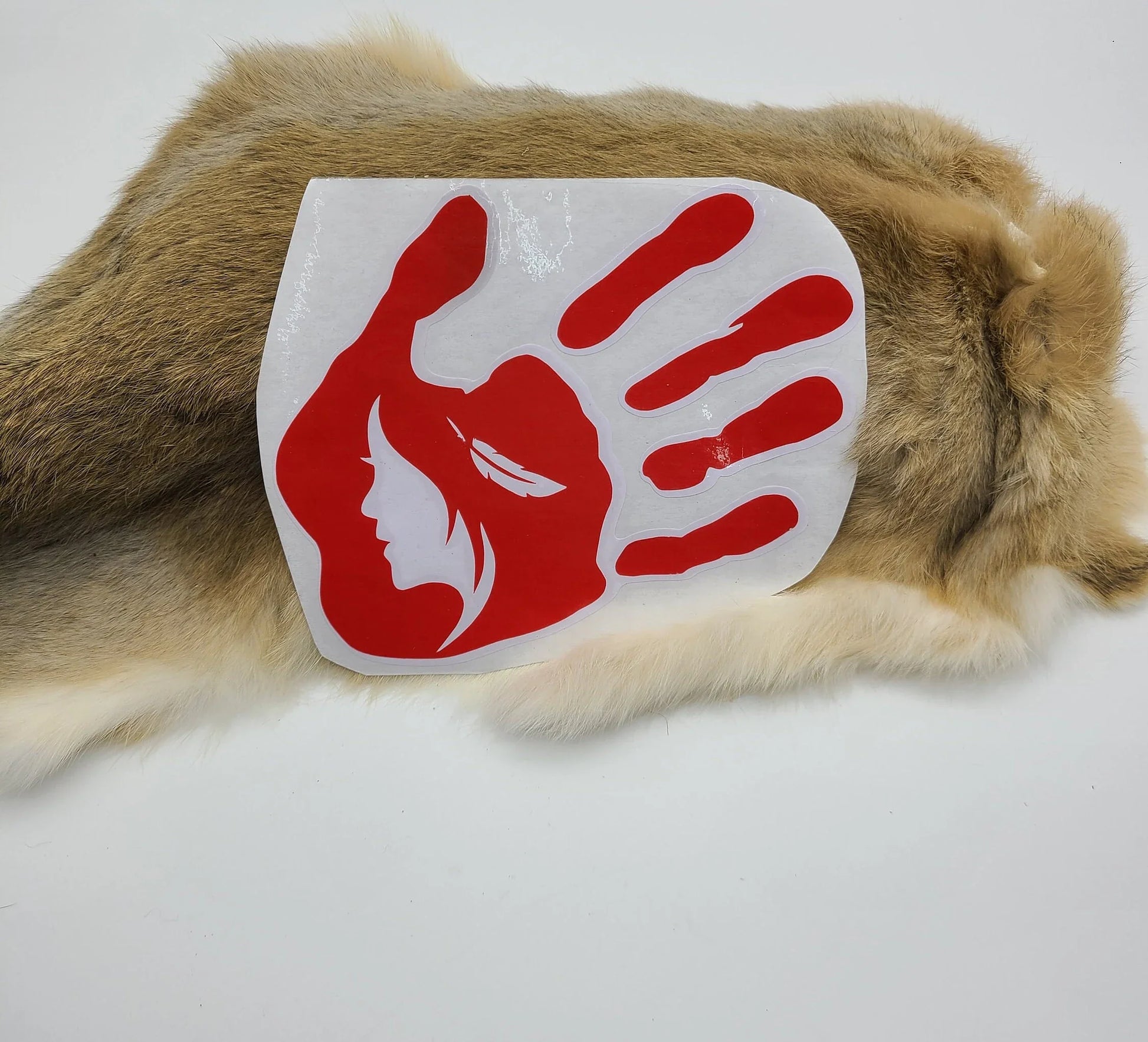 Indigenous made in house, these vinyl stickers are made to honor and support MMIW. Our tribute design not only stands out above the rest, they stand out much better on tinted windows as a result of stacking the Red dress or hand design on a white vinyl overlay. The vinyl we use is commercial grade. It is glossy, waterproof, durable, fade-proof and permanent. But Can be removed if necessary.